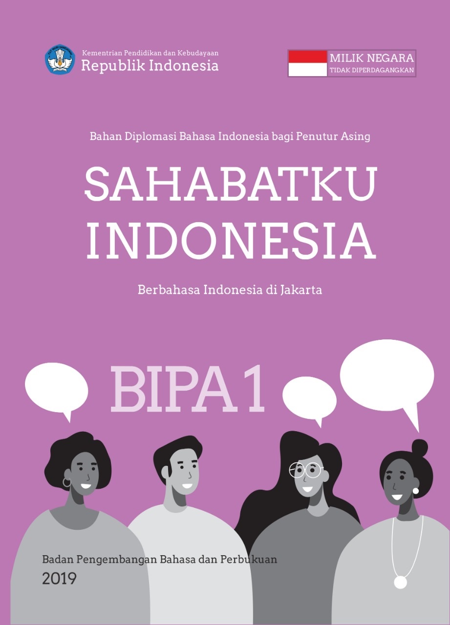 "Materi bahan ajar acuan yang berjudul Sahabatku Indonesia: Berbahasa Indonesia di Jakarta tingkat BIPA 1 ini ditujukan bagi pemelajar umum tingkat BIPA 1. Bahan ini memuat materi penggunaan bahasa Indonesia ragam umum oleh masyarakat lokal di wilayah Jakarta yang diwarnai unsur budaya lokal Jakarta. Buku ini terdiri atas 10 Unit yang memudahkan pemelajar asing untuk mempelajari bahasa Indonesia."