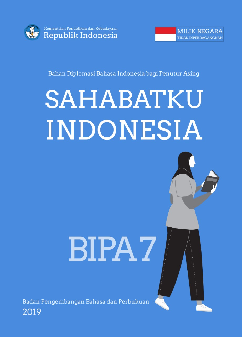 Buku ini merupakan bahan ajar BIPA level 7 yang digunakan sebagai bahan acuan pada pembelajaran BIPA yang merupakan kelanjutan dari buku BIPA 6. Buku ini berisi 10 Unit yang memudahkan pemelajar asing untuk mempelajari bahasa Indonesia. Buku ini digunakan untuk pembelajaran umum.