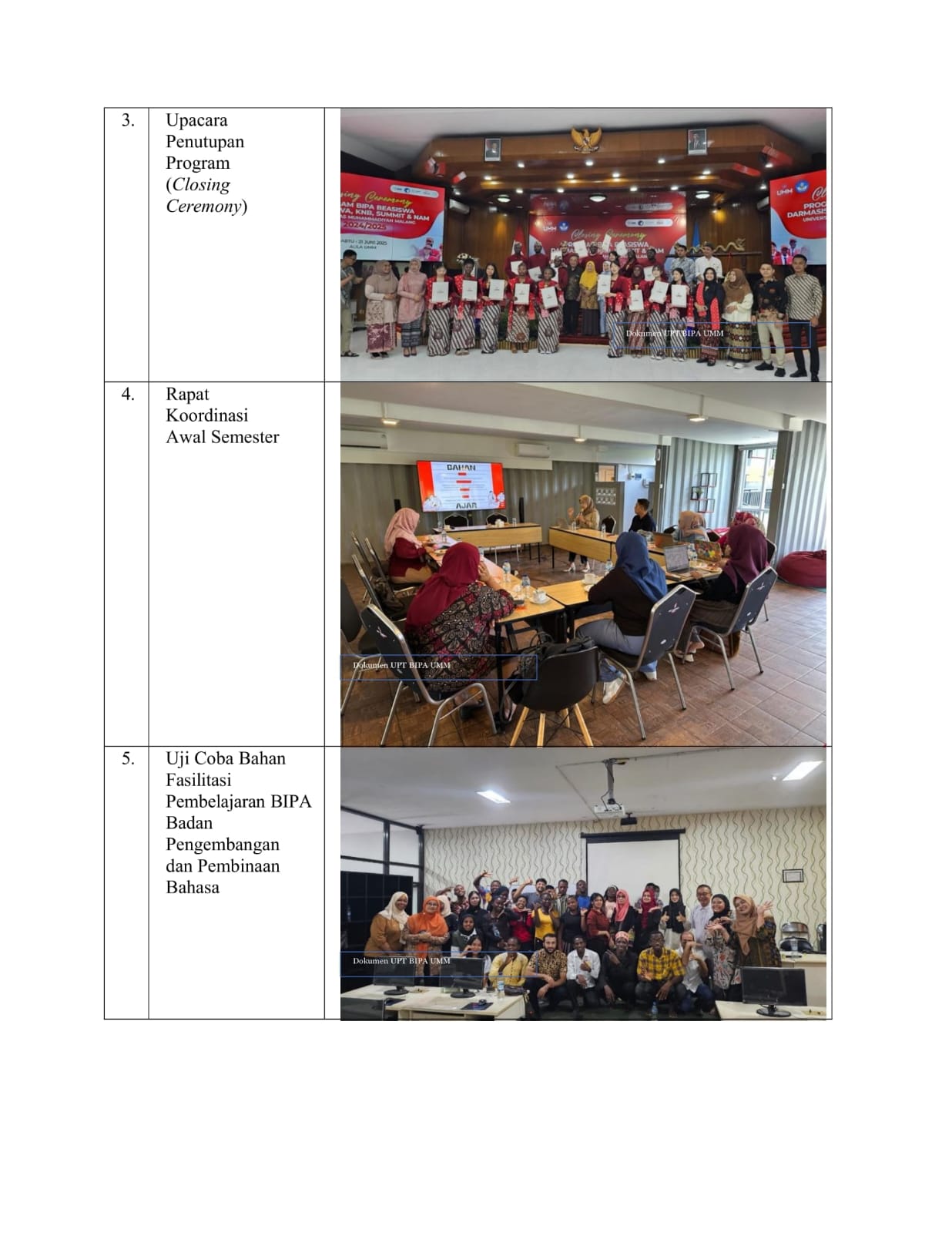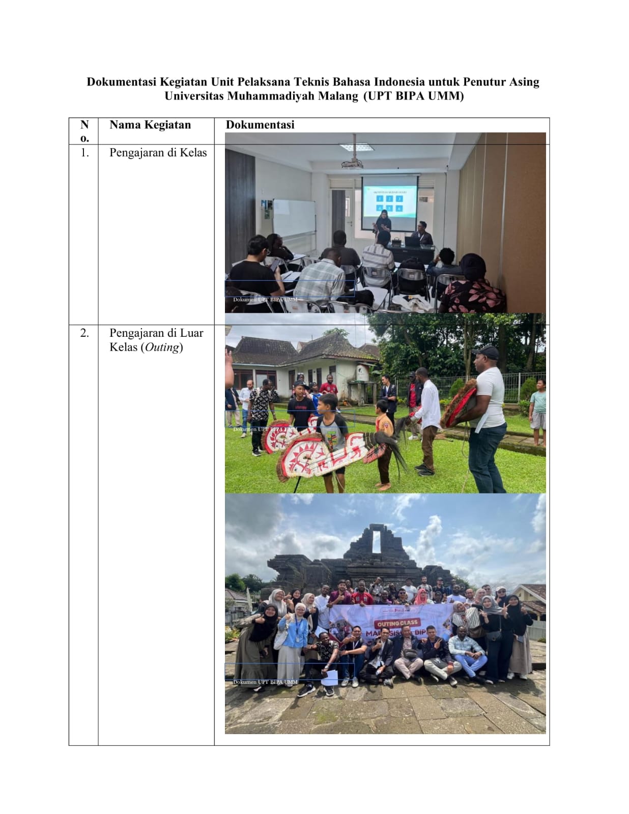 UPT BIPA UMM merupakan lembaga penyelenggara proses belajar bahasa dan budaya Indonesia yang terpercaya dan memiliki mitra berbagai negara di dunia. Keindahan tempat belajar yang memiliki nuansa alam yang indah serta ramahnya pelayanan pengajar dan staf menjadi keunggulan kami dalam melayani pemelajar asing yang ingin belajar bahasa dan budaya Indonesia. Tidak hanya itu kami juga memiliki berbagai macam program yang dapat anda pilih untuk meningkatkan ketarampilan dan pemahaman bahasa dan budaya Indonesa. Mari bergabung bersama kami untuk mempelajari dan mendalami bahasa dan budaya Indonesia.
